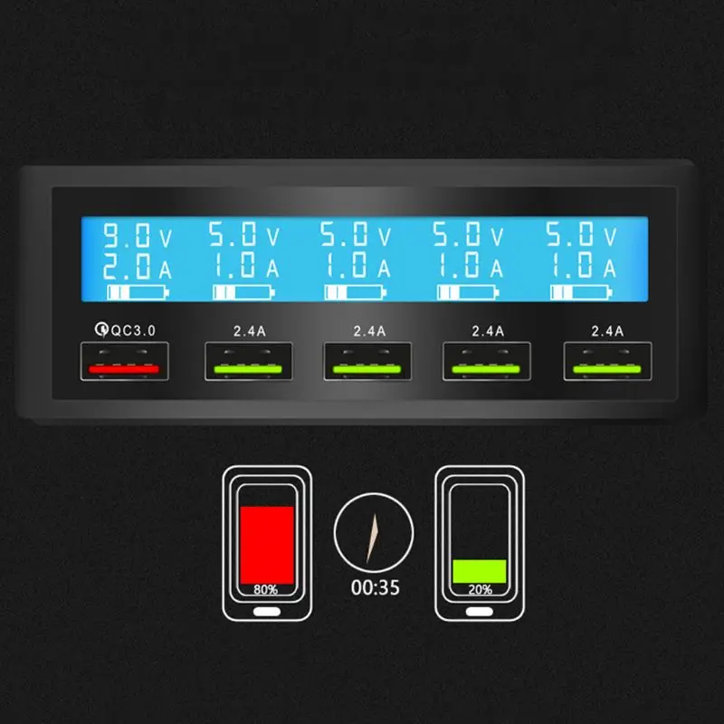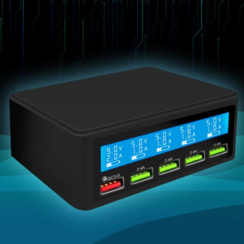 Best Product 5 Port USB QC 3.0 Quick Charger 5V 10A AC 100-240V LCD Voltage Current Display for iPhone iPad Sams